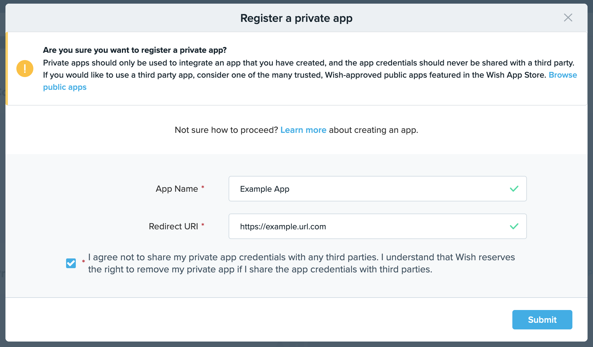 In order to access Wish data through the merchant API, you must first register a private app. This app will have to be authenticated using the OAuth 2.0 specification.