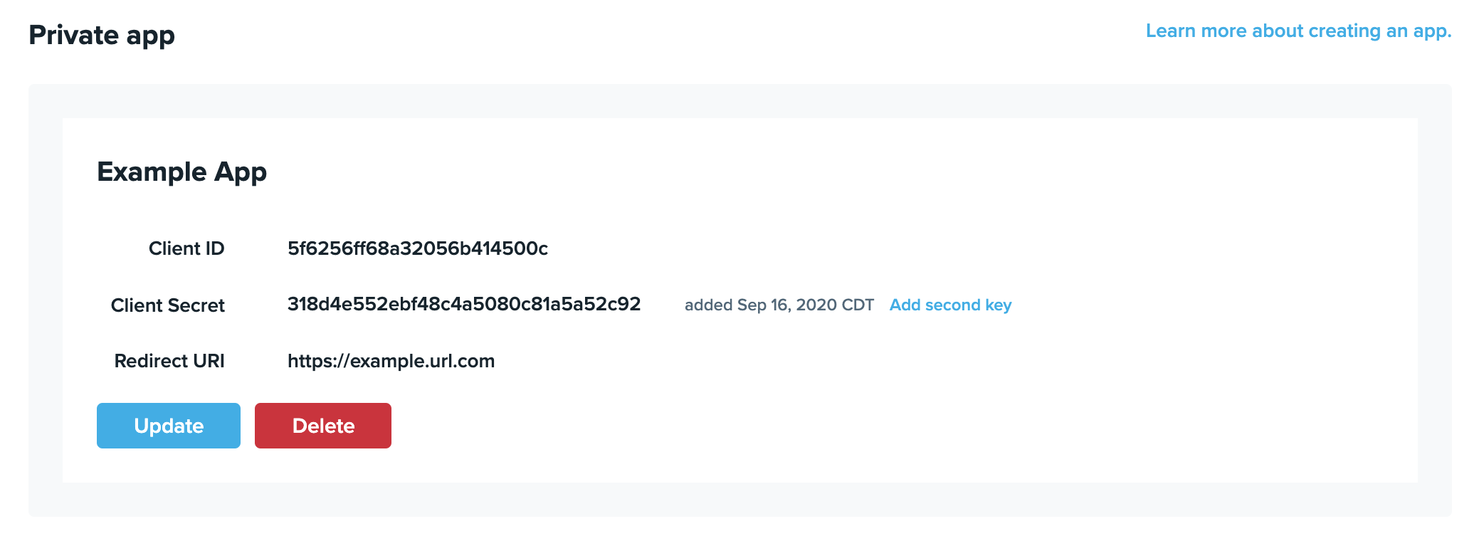 This page contains all the details of your private app that you will need to begin the authorization process.